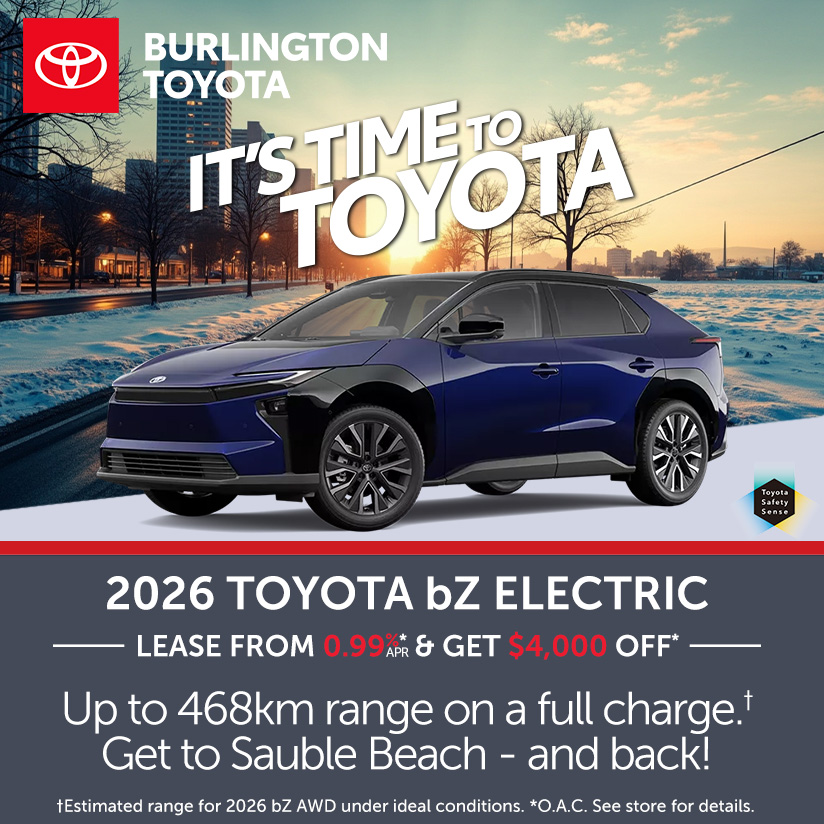 †Limited time lease offer available through Toyota Financial Services, on approved credit. Representative lease offer based on a new and previously unregistered 2026 bZ XLE FWD (BZFXLE A). 4.19% lease APR for 52 months. Weekly payment is $149.57 and includes $1,930 Delivery and Destination charge; $100 A/C charge; up to $999 retailer administration fee; lien registration fee (up to $40), lien registering agent fee (up to $4); $22 OMVIC fee; $18.00 EHF (tires)**; $1.08 EHF (filters) as well as all other applicable fees, levies and duties (all of which may vary by retailer). 225 weekly payments required. License; insurance; registration; and applicable taxes are extra. $4,500 down payment, $0 security deposit and first weekly payment due at lease inception. Total lease obligation is $38,152.75. 96,000 kilometre allowance; charge of $0.15/km for excess kilometres. Advertised offers applicable in Ontario only. Retailer may lease for less. Retailer order/trade may be necessary (but may not be available in all cases). Conditions apply. Offer ends February 2, 2026 and is subject to change or cancellation without notice. See your participating Ontario Toyota dealer or visit Toyota.ca for details.